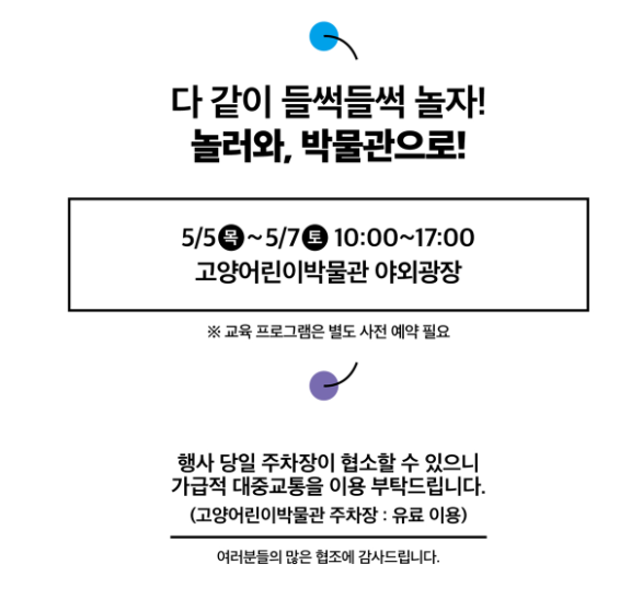 고양시 어린이박물관에서 어린이날 행사를 진행하는데요. 5일부터 7일까지 진행되는 행사입니다. 사전예약이 필요한 것도 있으니 참고하시기 바랍니다.
