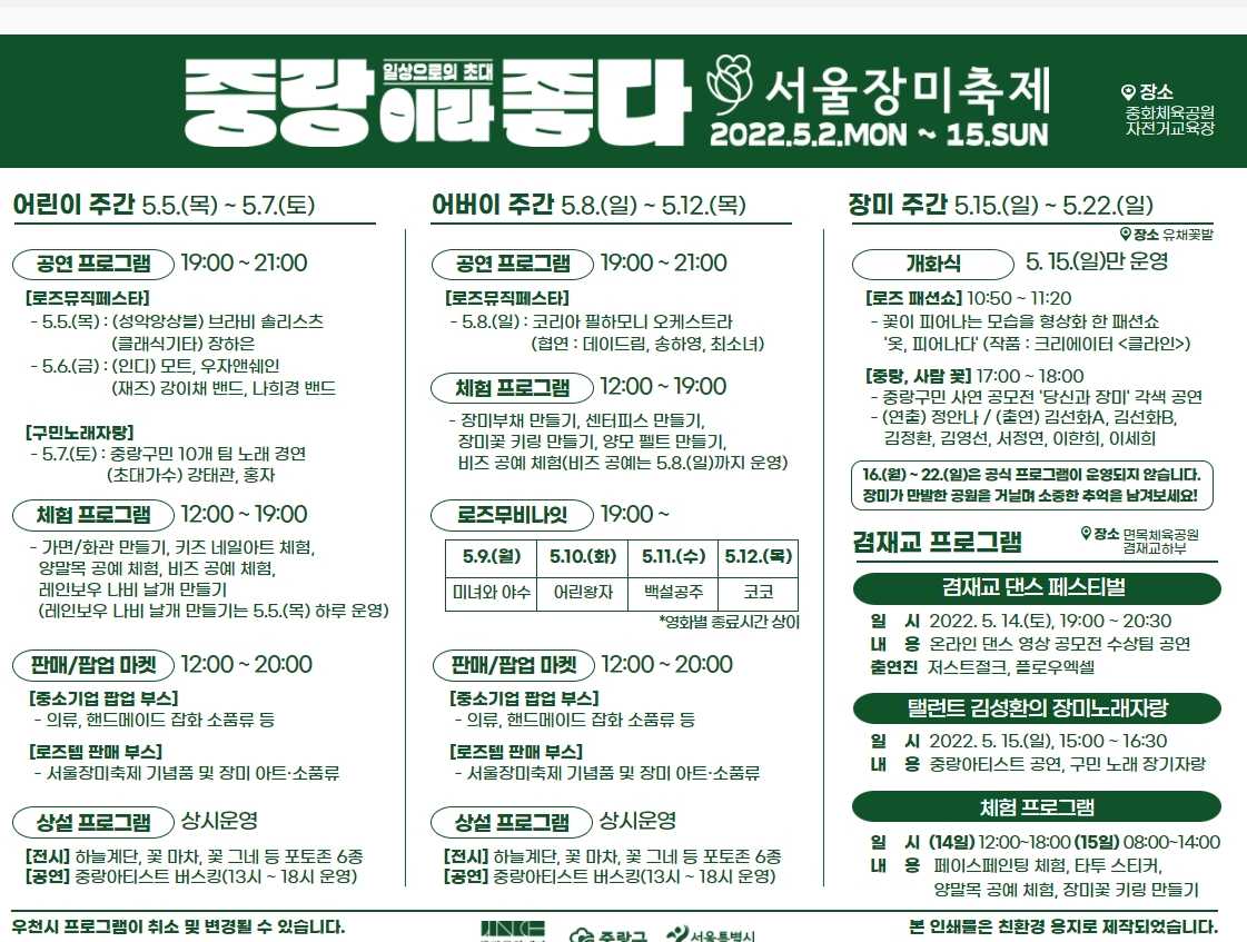 ○ 장 소 : 중랑장미공원, 중화·면목체육공원, 중랑구 전역