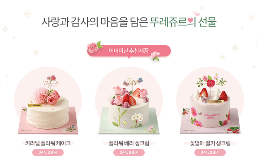 뜨레쥬르에서는 어버이날을 맞아 카네이션 케이크 3종을 출시하였는데요. 토퍼까지 같이 있으니까 한번에 선물 해결이 가능해 보입니다. 카라멜 플라워 케이크, 플라워 베리 생크림 케잌, 꽃밭