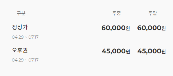 이용요금과 원마운트에서 제공하는 할인요금입니다.
