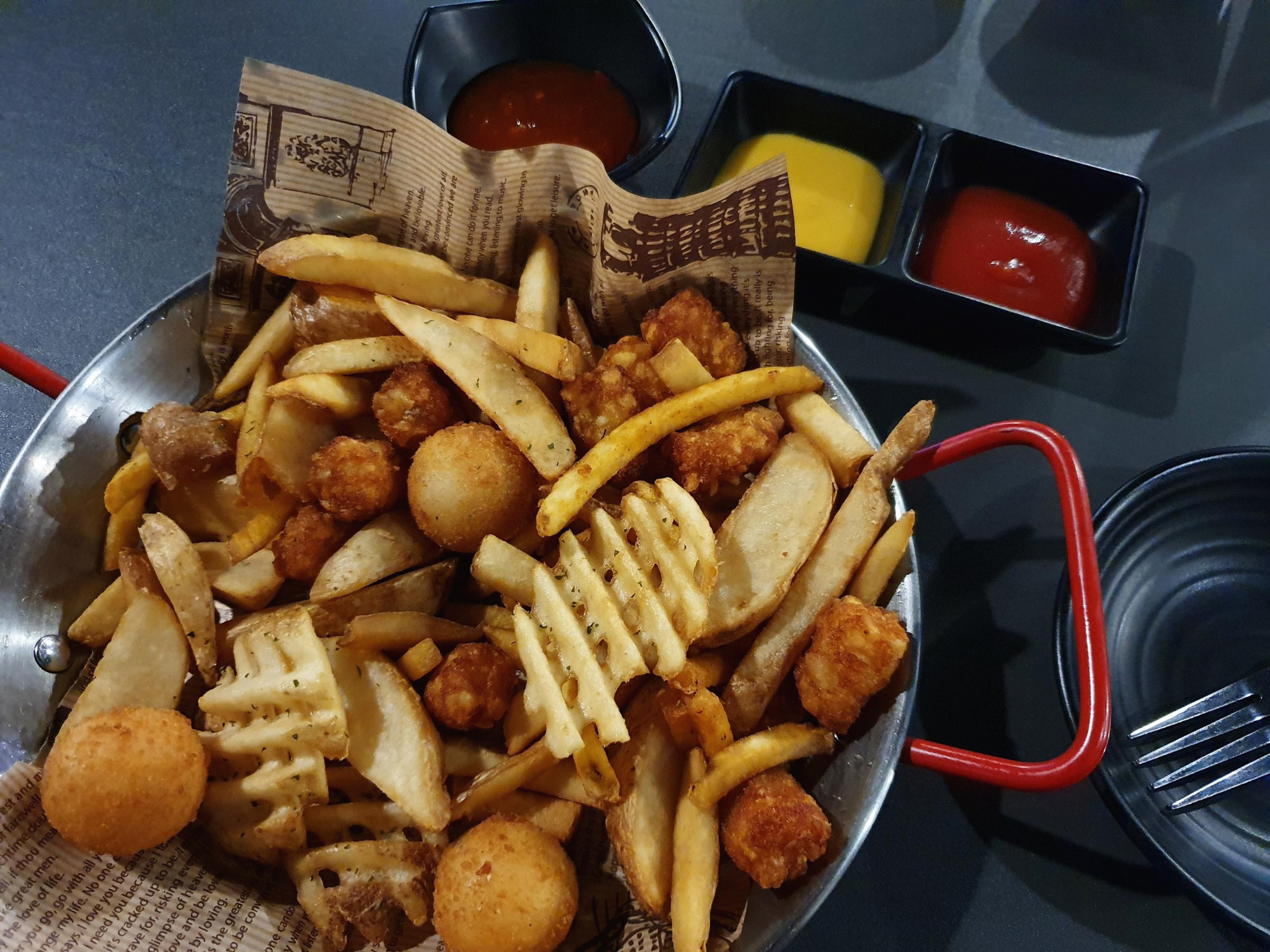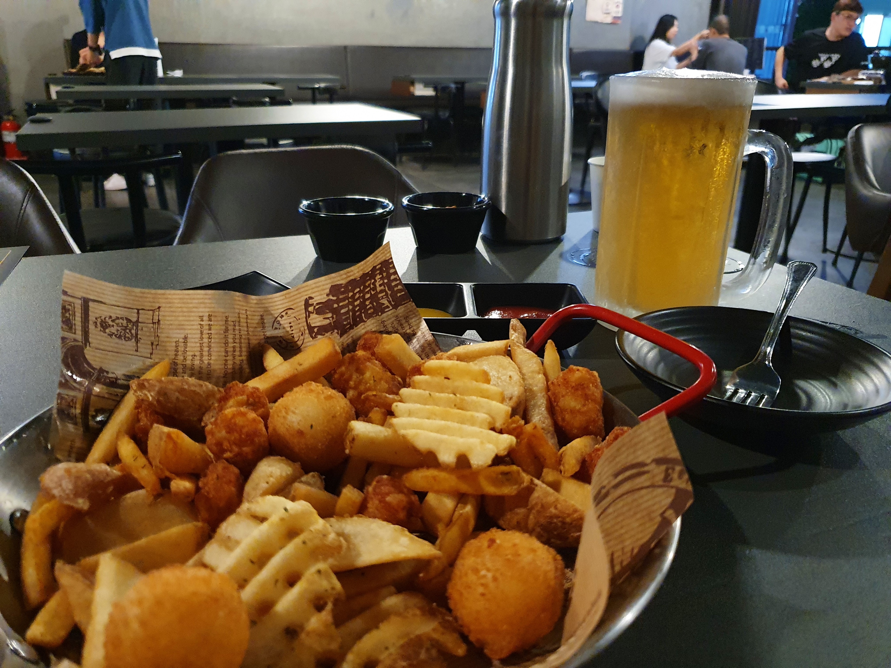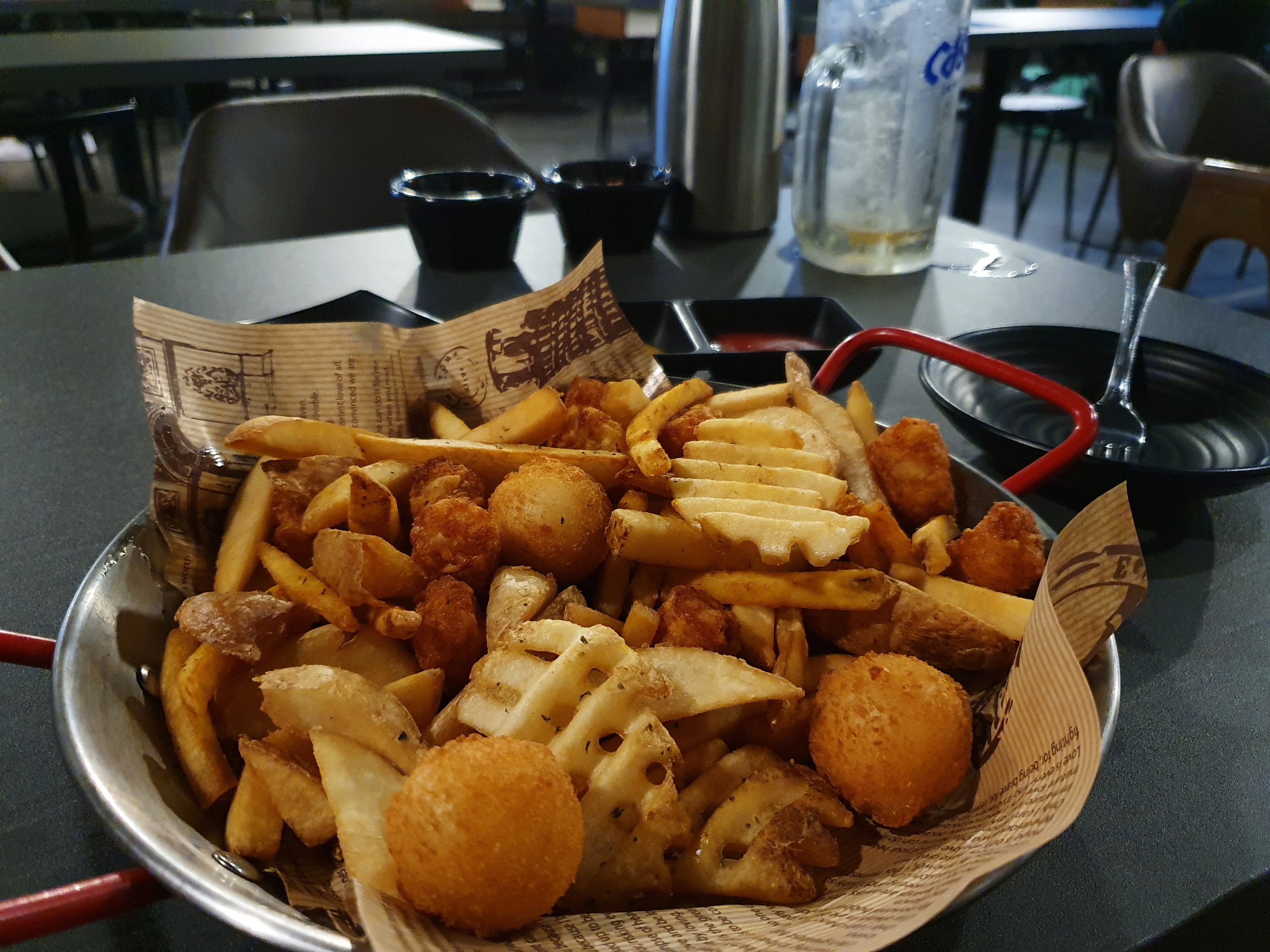 모둠 감자튀김은 정말 혜자스러운데, 다양한 종류들의 감자튀김을 골라먹을 수 있는 재미가 있어서 아주 만족스러웠습니다. 소스는 무려 3종류가 제공되는데 칠리 소스가 제일 맛있더군요!