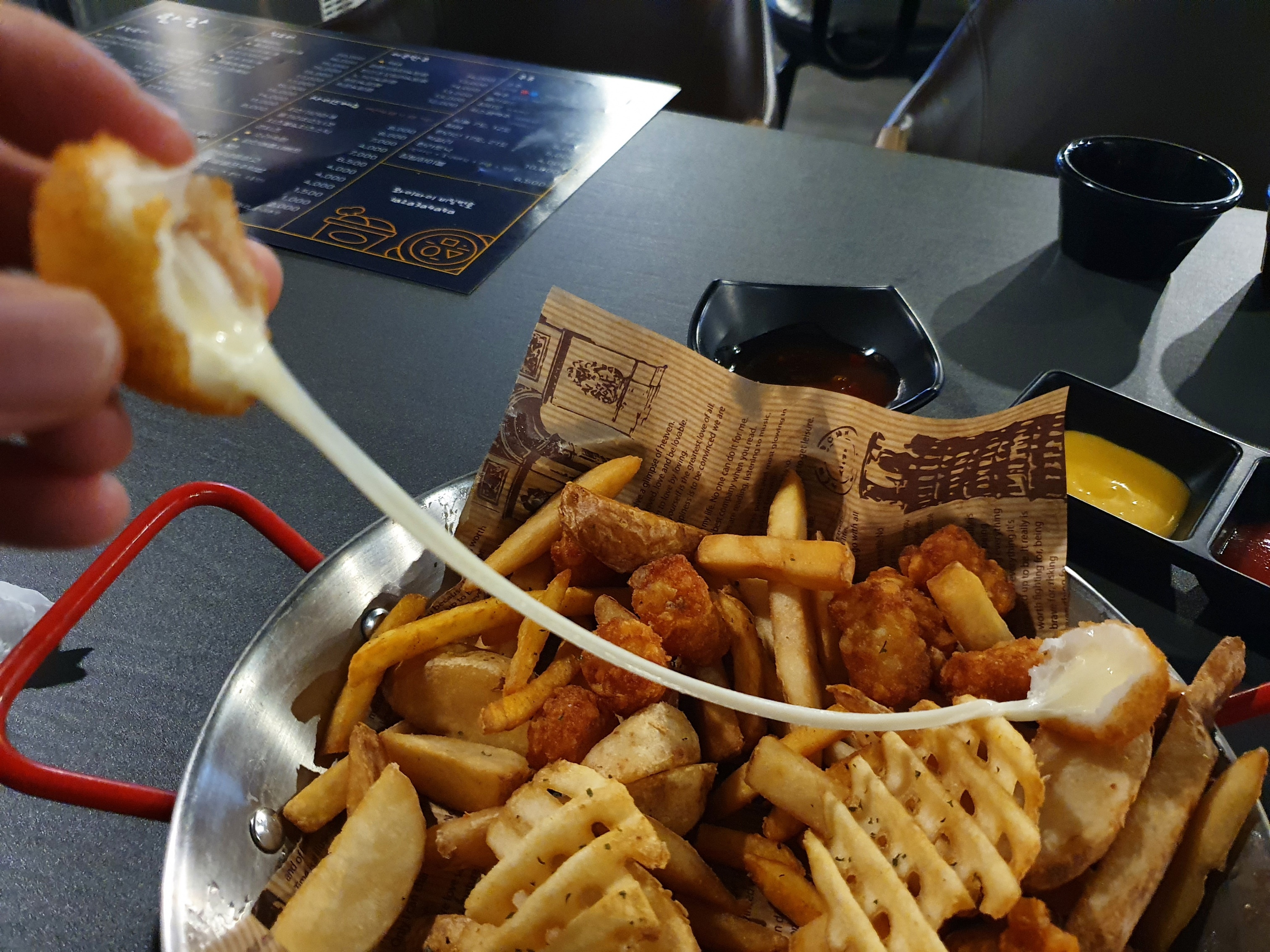 금방 튀겨내서 미친듯이 늘어나기만하고 끊어지지 않는 치즈볼이 참 인상적이더군요.