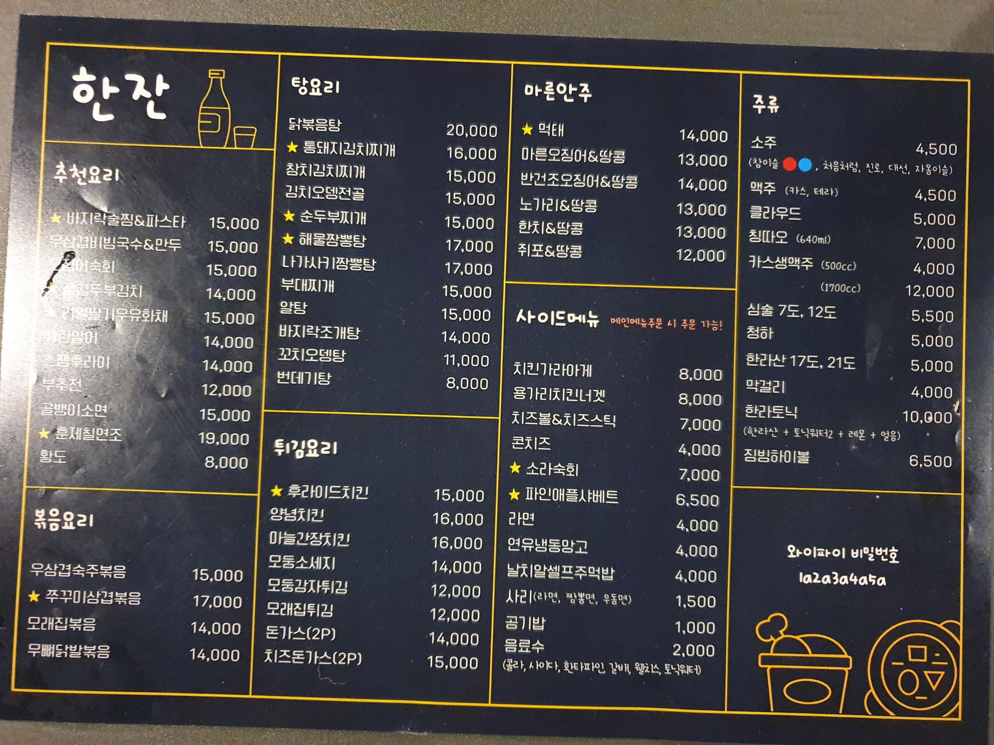 와이파이 비밀번호는 "1a2a3a4a5a" 입니다. 알코올에 뇌를 정복당해도 와이파이 비밀번호를 입력하기 크게 어렵지 않아요. ^^