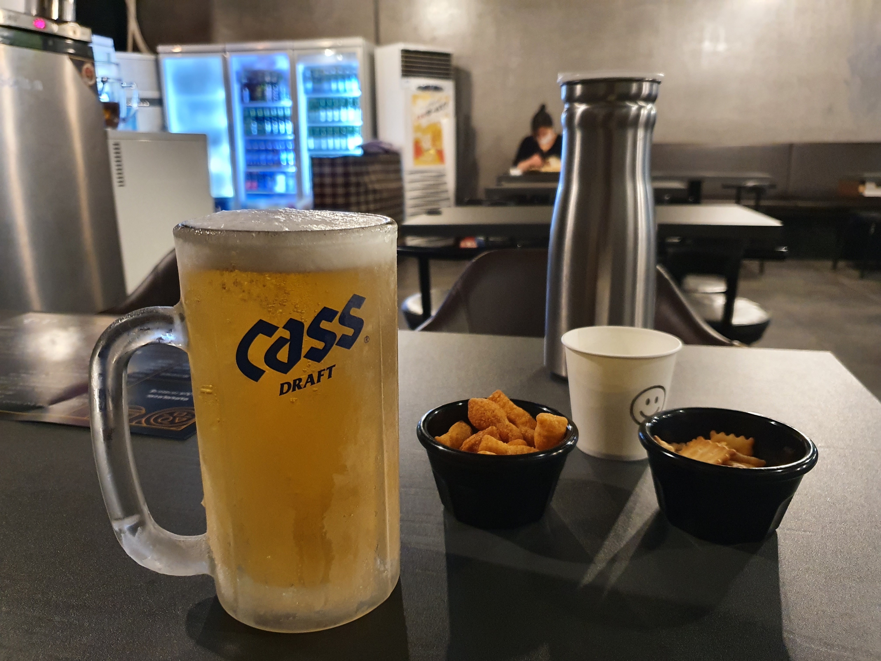 안주가 나오기 전에 생맥주 한 잔을 다 마셔버렸습니다.