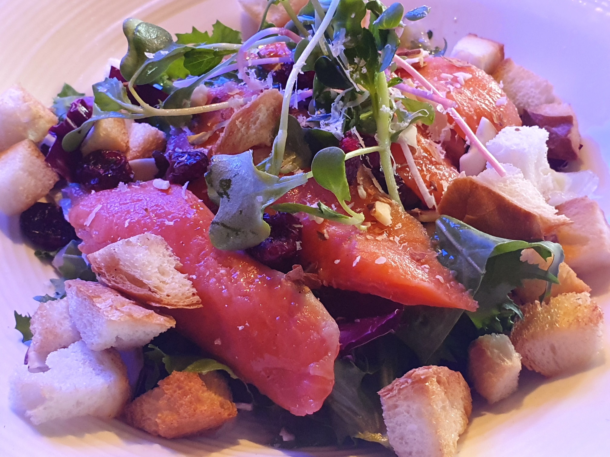 위의 사진은 단골회원 이벤트로 무료로 즐겼던 훈제연어샐러드입니다.