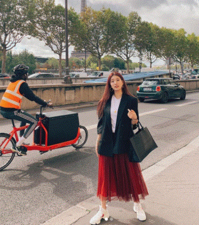 레드 플리츠 스커트와 캐주얼한 스니커즈 둘 다 디올 제품입니다. 가방도 디올 제품이고요. 스커트는 듈 레이어가 여러 겹으로 화려한 스타일의 제품이고요. 스니커즈는 네오프렌 디 커넥트 제품으로 수지와 잘 어울리는 디올 운동화 같습니다. 수지님은 스포티한 제품도 잘 어울리네요.