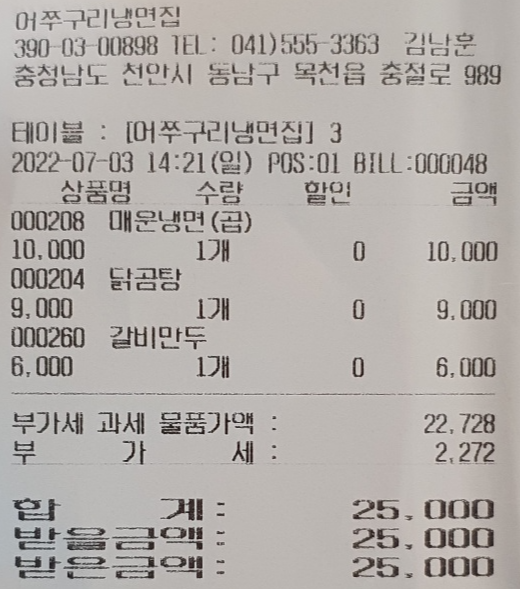 제가 주문했던 것은 청량리 매운 냉면 곱빼기였는데, 막상 나온 것은 그냥 일반 청량리 매운 냉면이었습니다. 집에 도착해서 영수증이 잘못되었다는 것을 인지하고 식당에 전화했더니, 차액 2천 원을 친절하게 돌려주시더라고요. 저도 결제할 때 확인을 했어야 했는데, 이미 집에 도착한 후라서 어쩔 수 없었네요. 전화 응대도 친절하게 해 주시고, 잘못 결제된 부분은 바로 계좌로 돌려받을 수 있어서 좋았네요.