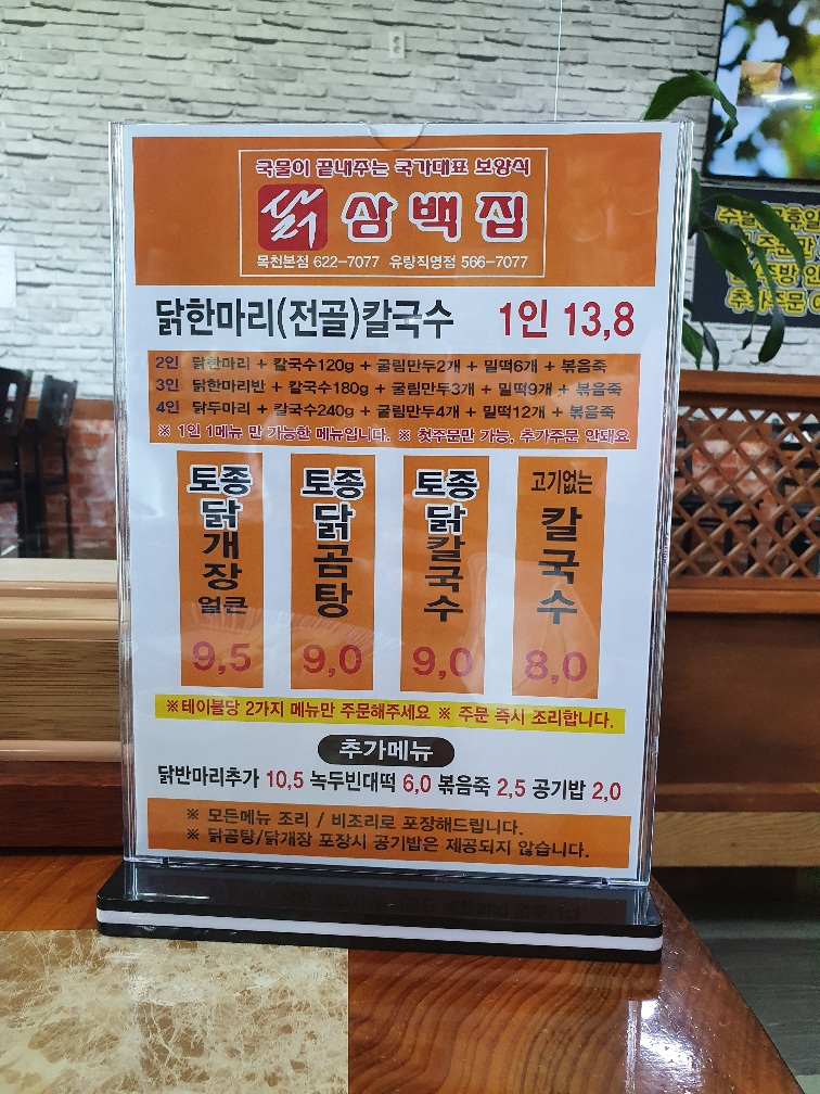 왼쪽이 닭삼백집 메뉴판이고, 오른쪽이 냉면집 메뉴입니다.