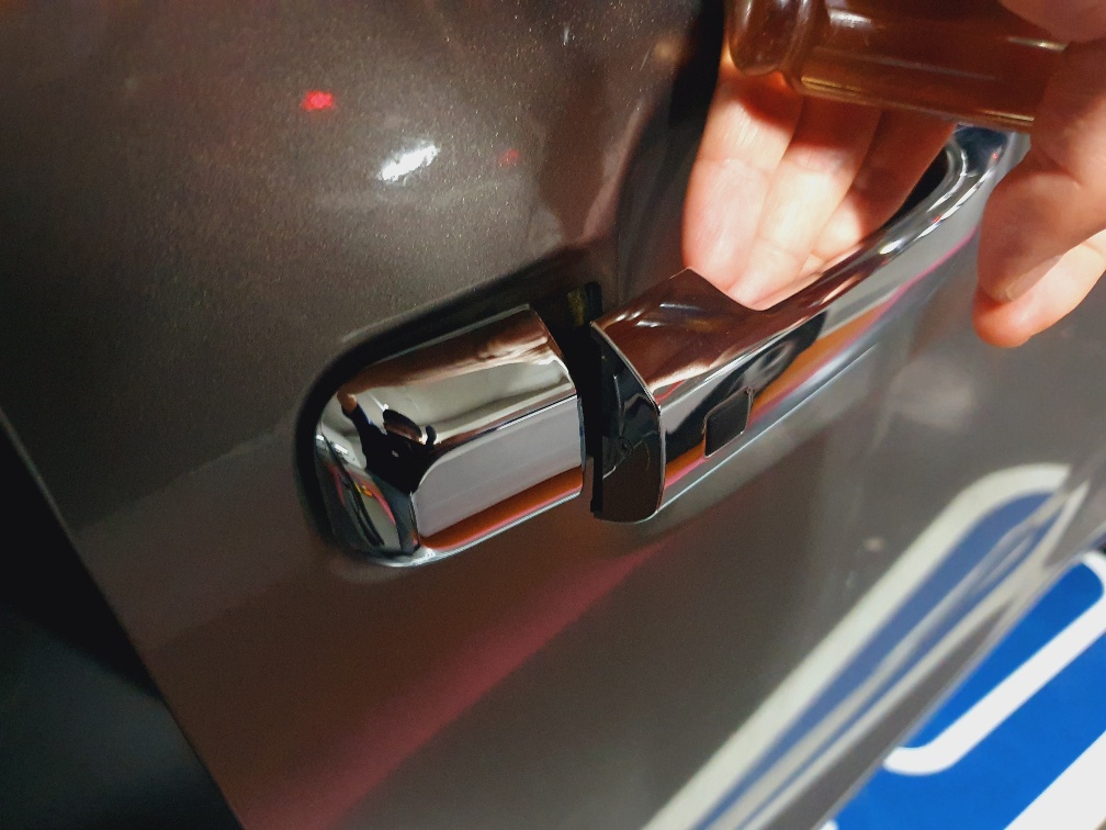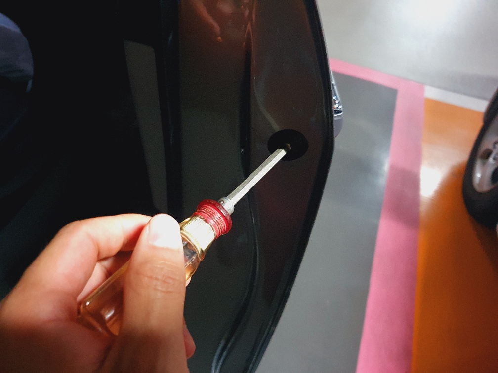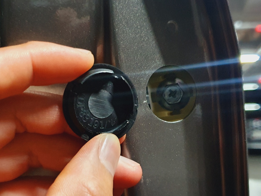 도어를 손잡이를 살짝 열고 커버 부품을 끼워 넣은 후에, 십자 나사로 고정합니다. 아까 탈거했던 실링 커버를 다시 장착해주면 깔끔하게 도어 커버 수리가 완료됩니다.