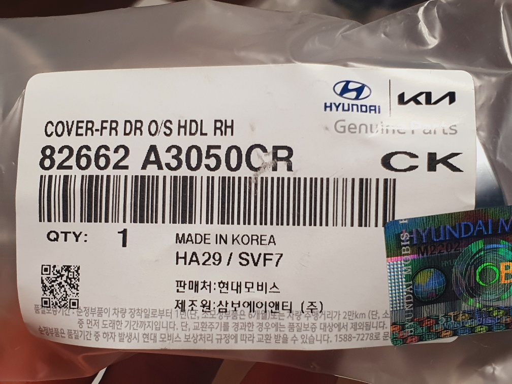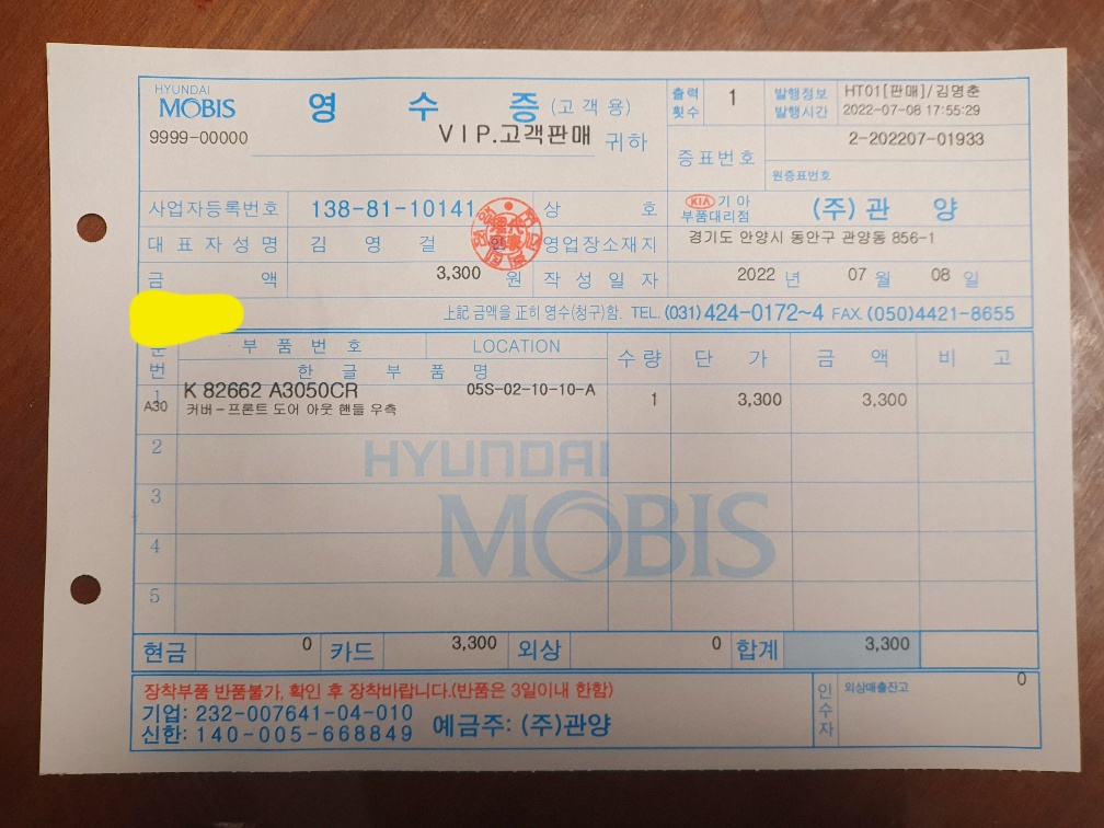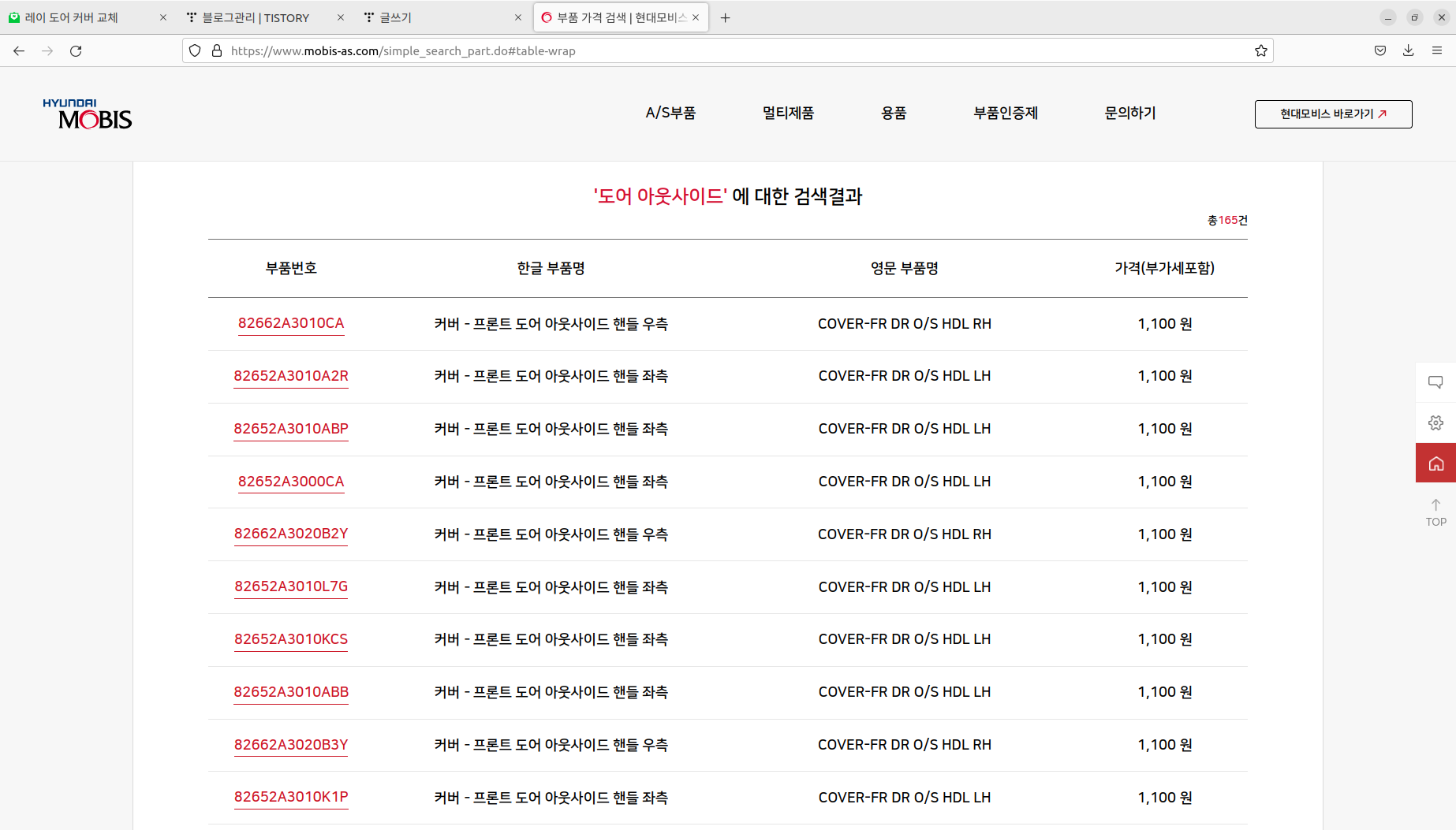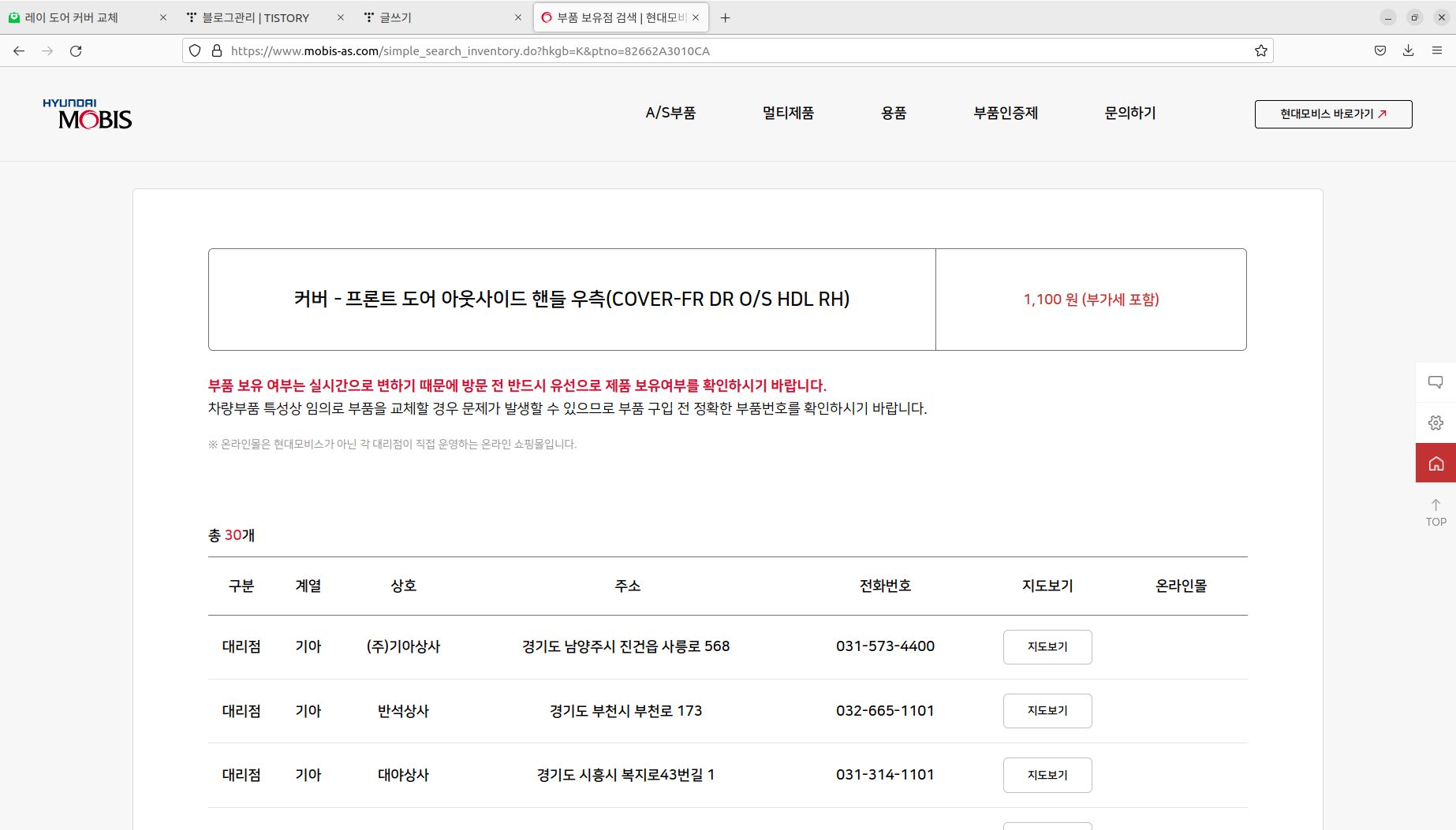 우선 도어 커버는 경기도 안양시에 위치한 현대모비스 관양상사에서 3,300원에 구입했습니다. 현대모비스 홈페이지에서 부품 제고가 있는 것을 확인하고 방문했습니다.