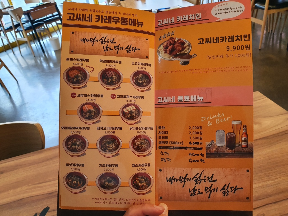 블로그 쓰다가 지금 발견한 대박 정보! 메뉴판에 치킨이 있네요. 카레치킨과 같이 먹을 생맥주, 소주, 맥주 이런 것들도 있네요.