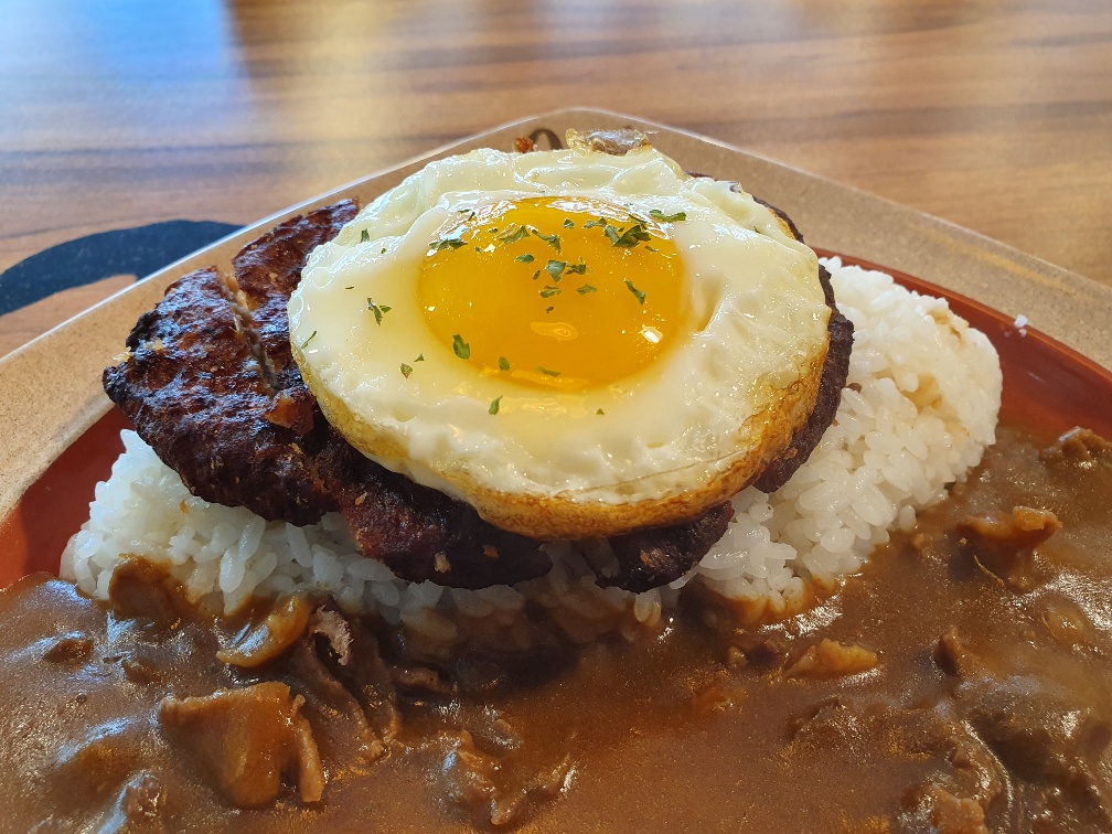 쇠고기 카레 + 밥 + 떡갈비 + 달걀 후라이가 예쁘게 셋팅되어 있습니다.