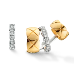 샤넬 웹사이트의 Coco Crush 이어링, 18K 화이트 골드와 옐로우 골드, 다이아몬드로 이루어진 퀼팅 모티브 이어링.