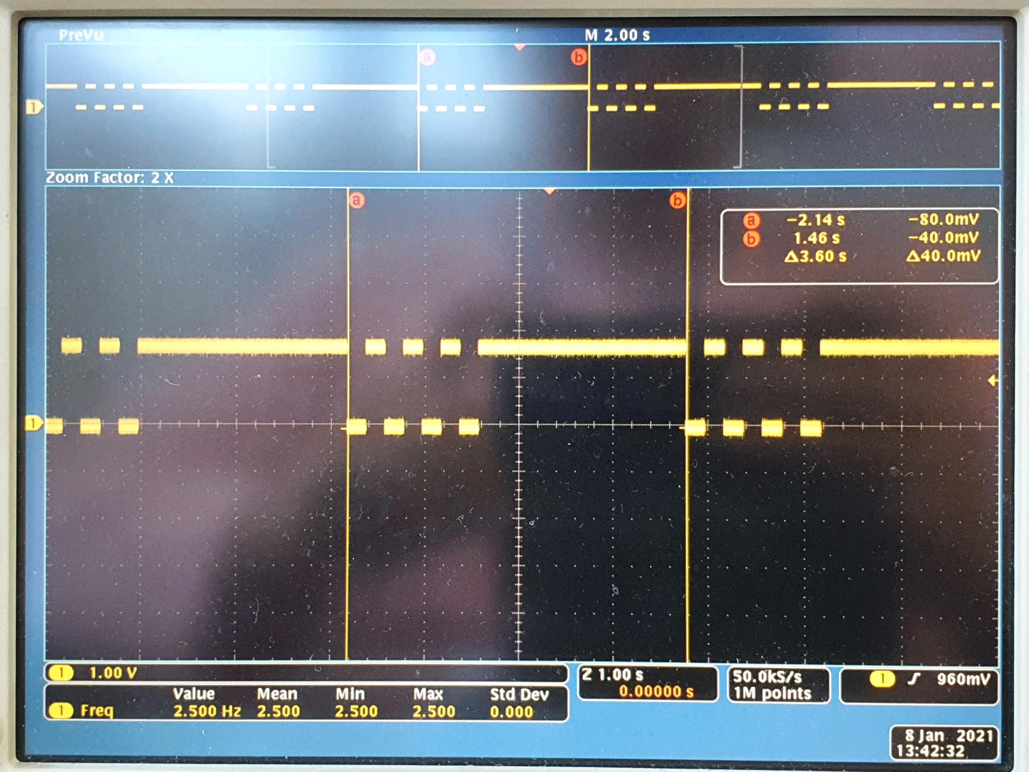 오실로스코프로 LED의 파형을 측정해보면 아래와 같습니다. 사실 오실로스코프로 측정할 필요도 없이 눈으로 확인하면 되지만, 좀 더 시각적으로 보여드리기 위해서 사용하였습니다. 눈으로 LED를 확인했던 것처럼 약 4초 주기로 LED가 4번 On 되는 것을 보실 수 있습니다. (LED 신호가 Low Active이기 때문에 Low일 때 켜지고, High일 때 켜지는 점에 유의하세요.)