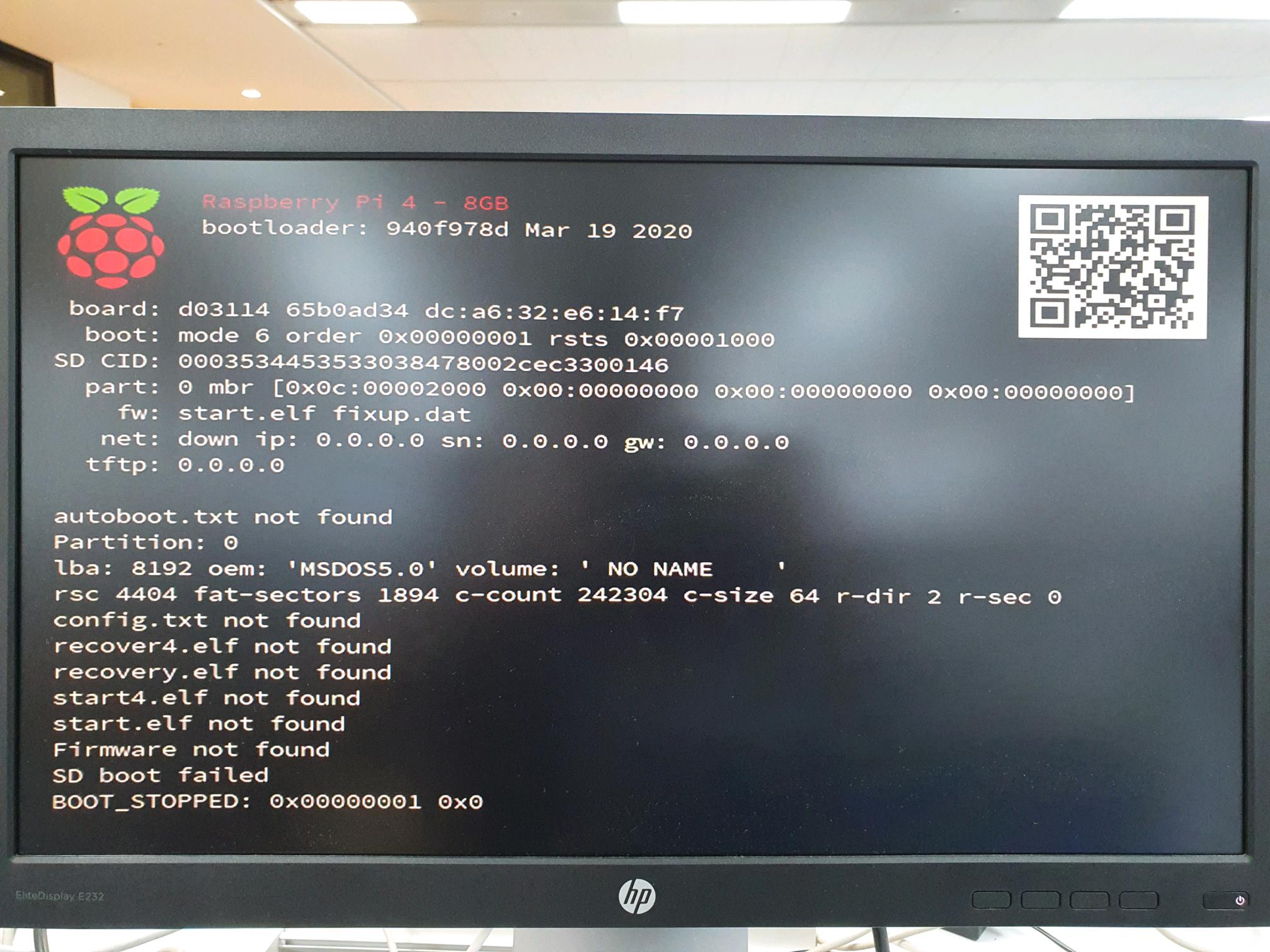 | autoboot.txt not found Partition: 0 lba: 8192 oem: 'MSDOS5.0' volume: ' NO NAME ' rsc 4404 fat-sectors 1894 c-count 242304 c-size 64 r-dir 2 r-sec 0 config.txt not found recover4.elf not found recovery.elf not found start4.elf not found start.elf not found Firmware not found SD boot failed BOOT_STOPPED: 0x00000001 0x0 |