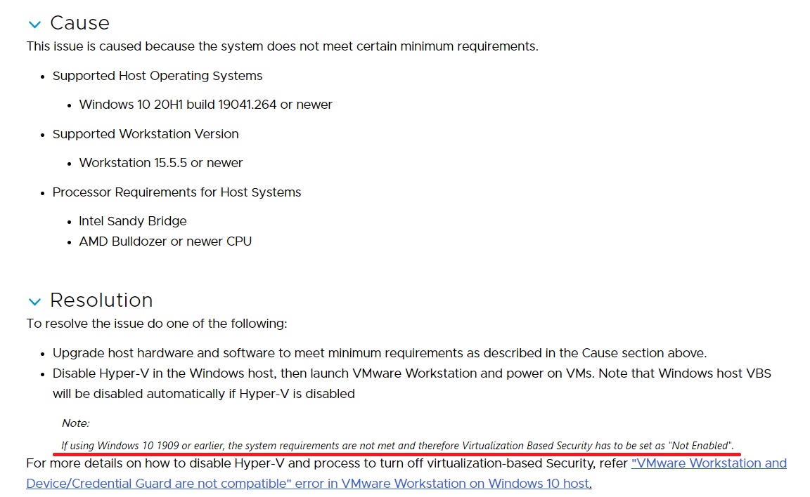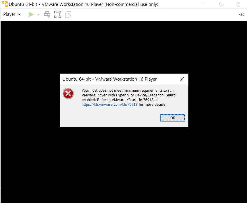 | Your host does not meet minimum requirements to run VMware Player with Hyper-V or Device/Credential Guard enabled. Refer to VMware KB article 76918 for at https://kb.vmware.com/kb/76918 for more details. |
