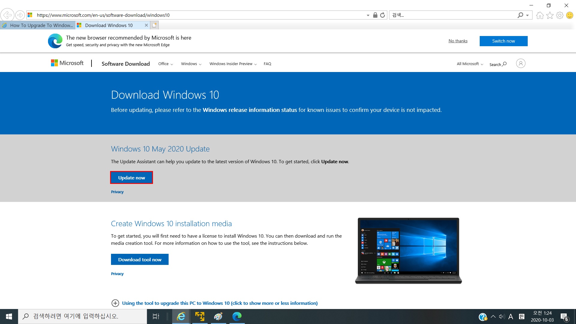 그리하여 www.microsoft.com/en-us/software-download/windows10 에 접속하여 최신 Windows10으로 업데이트할 수 있었습니다. 그리고 VMware Workstation 16 Player를 실행해보니 정상적으로 동작하더군요.