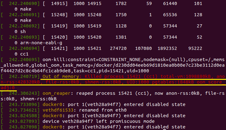 [ 242.240695] oom-kill:constraint=CONSTRAINT_NONE,nodemask=(null),cpuset=/,mems_allowed=0,global_oom,task_memcg=/docker/d230dd04eeb69d1810ea0b00e7c23be3112d0eaf44427d2c8c4b64fc1cab9de8,task=cc1,pid=15421,uid=1000