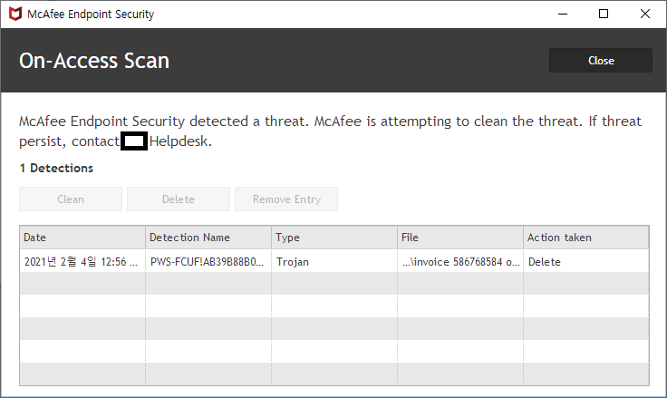 이번에는 실제로 다운로드해서 압축을 해제해봤습니다. 압축을 해제하자마자 "invoice 586768584 over due"라는 파일이 생성되자마자 바로 삭제되었습니다. McAfee Endpoint Security라는 프로그램에서 해당 파일을 바로 삭제하네요. Daum 메일에서 1차적으로 바이러스를 걸러주고, 2차적으로 Anti-Virus 프로그램에서 또 한 번 걸러주는 것 같네요.