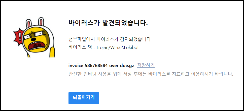 바이러스 명은 Trojan/Win32.Lokibot이라는 바이러스네요. 친절하게 바이러스를 치료하고 실행하는 게 좋다고 가이드까지 줍니다. 훌륭한 다음 메일 서비스네요.