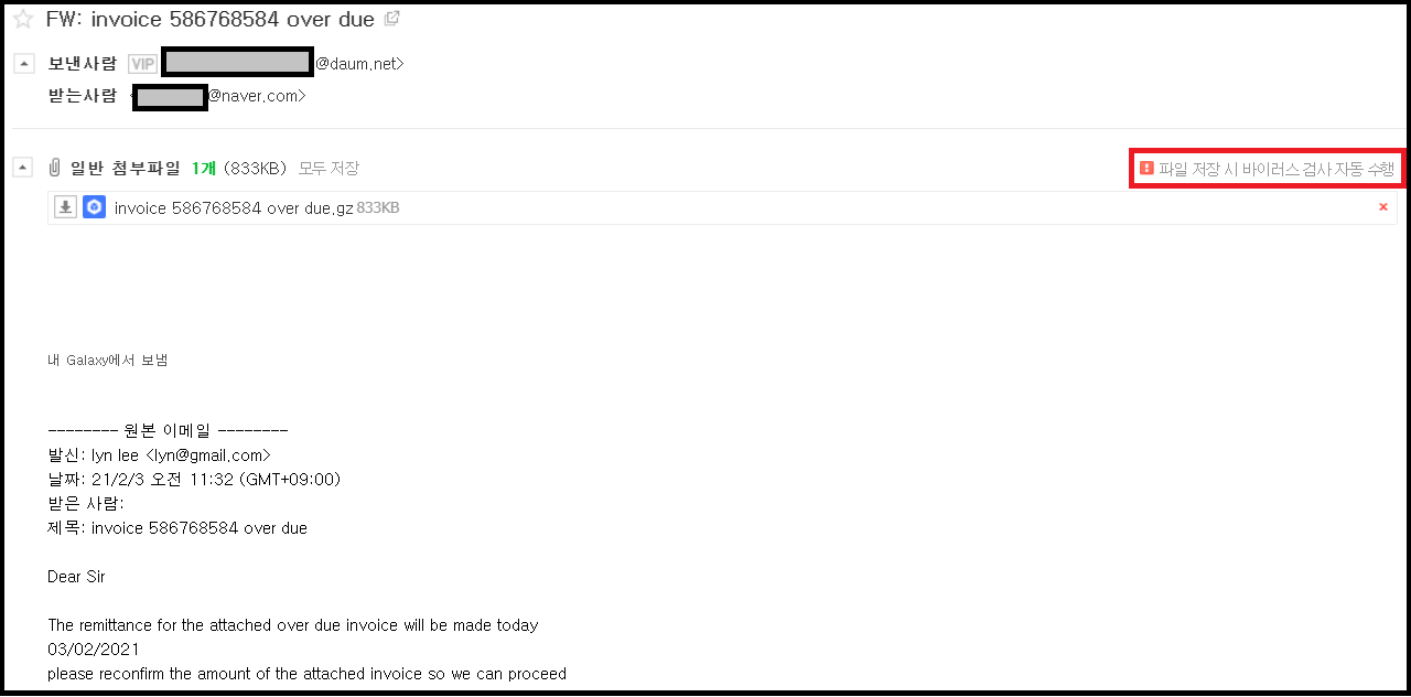 Daum 메일에서는 해당 바이러스를 제대로 검출했습니다. 그렇다면 네이버도 이 바이러스를 검출할 수 있는지 확인해보기 위해서 제 네이버 메일로 전송해봤습니다.