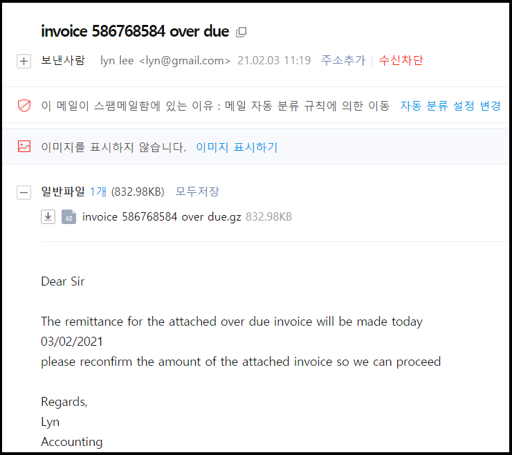 여러분들도 혹시나 "invoice 586768584 over due"라는 메일을 받으시면 첨부파일을 다운로드하시지 마시고 그냥 삭제하시기 바랍니다. 메일을 수신하시고 실행하기 전에 검색을 해보시고 이 페이지에 들어오셨다면 참 잘하신 일입니다.