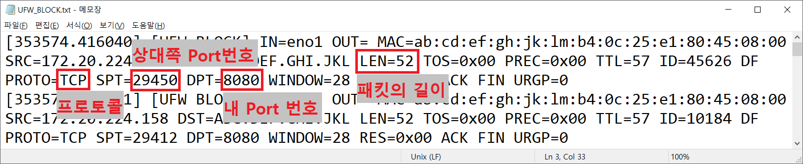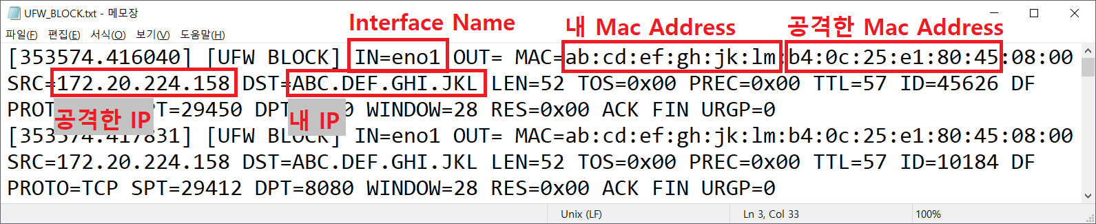 최근 회사 서버에 문제가 좀 있는 것 같아서 dmesg 명령을 통해서 로그를 살펴보기로 했습니다. 로그를 자세히 살펴보니 UFW BLOCK 메시지로 도배가 되어 있네요. 172.20.224.158이라는 IP가 8080 포트로 여러 차례 접속을 시도해서 방화벽에 걸렸네요.