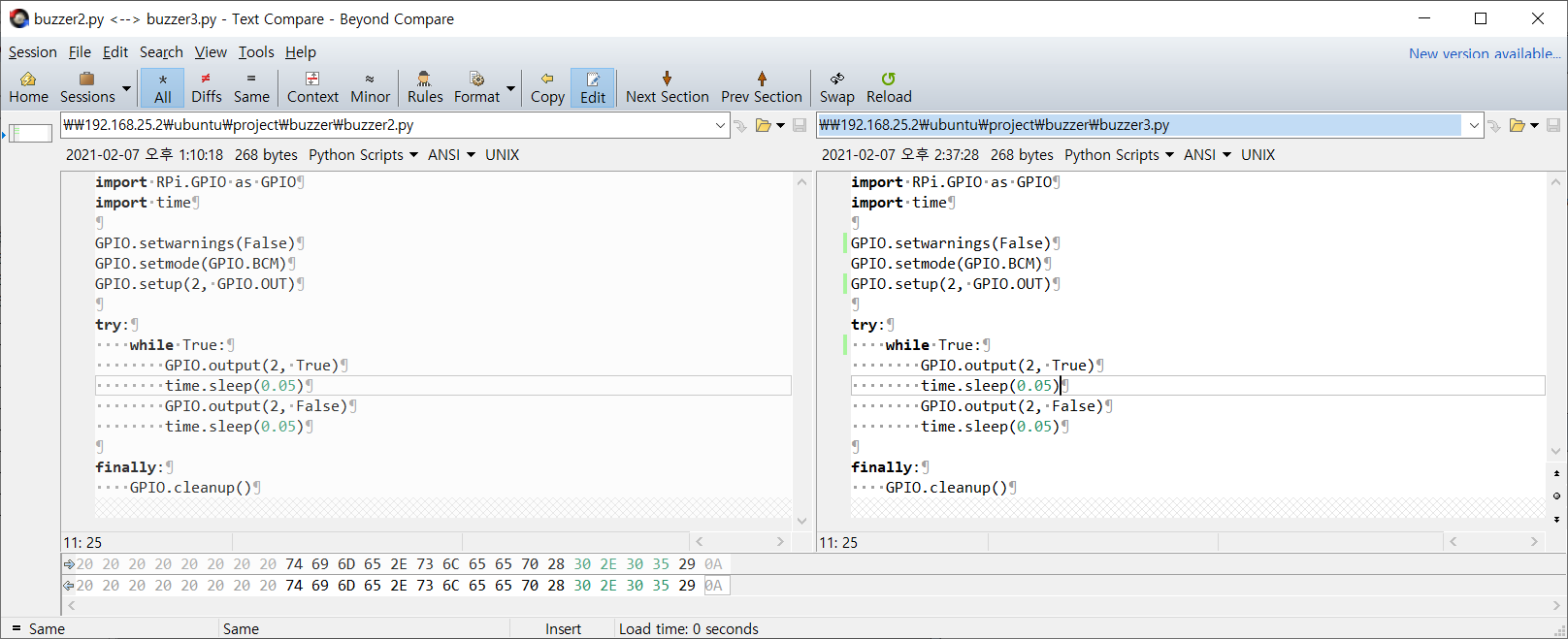 설정 이후 Beyond Compare 툴을 통해서 파일을 저장해 보면 White Space가 자동으로 삭제되는 것을 확인하실 수 있습니다.