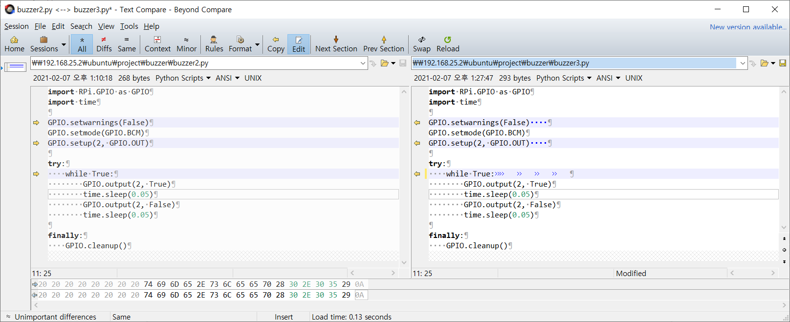 Beyond Compare 프로그램을 이용해서 소스 코드의 변경점을 비교 시에 Minor 옵션(Ignore Unimportant 옵션)을 끈 상태로 비교해보면 아래와 같이 공백이 다른 부분에 대해서도 표시가 됩니다.