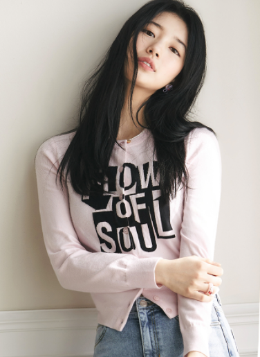 수지님은 게스의 모델인데요. 게스 화보촬영중에 입은 핑크 가디건과 청바지입니다.