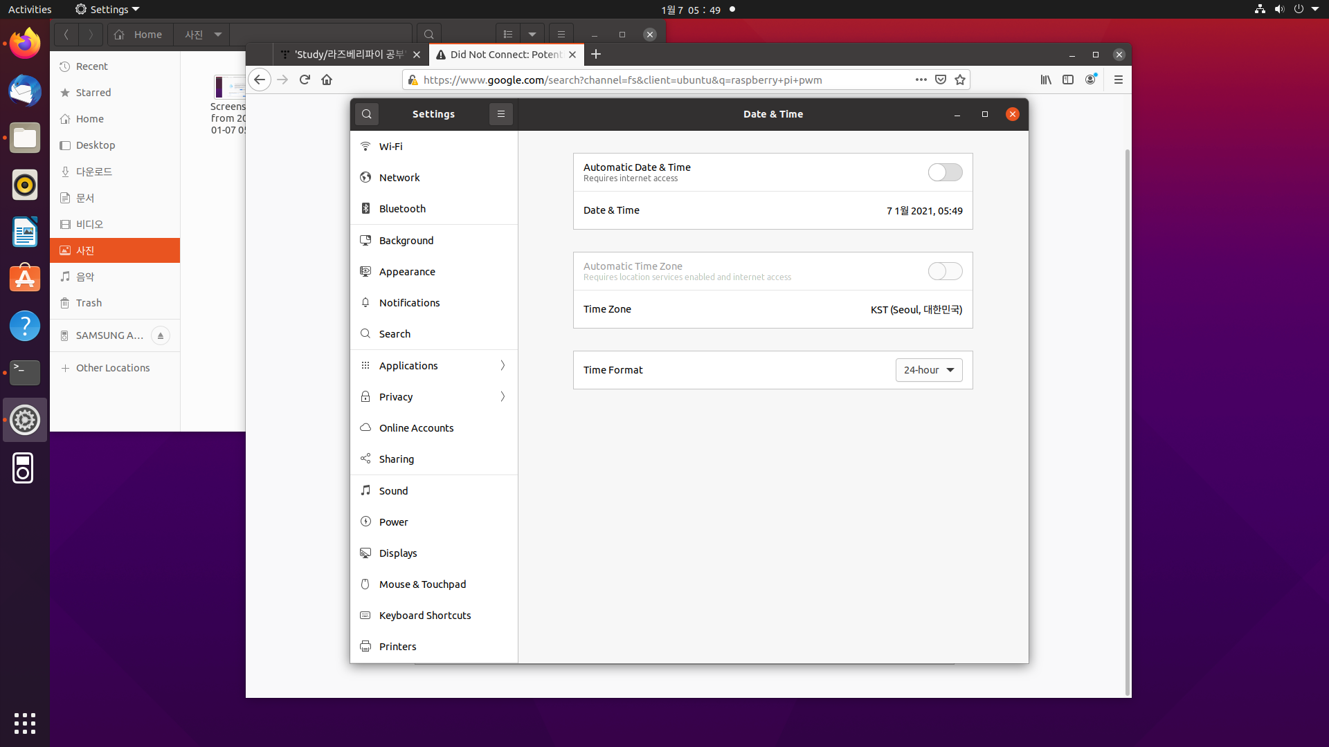 "Your Computer Clock is Wrong"이라는 메시지였는데, 실제로 살펴보니 날짜가 약 3개월 전으로 되어 있는 것입니다. 그렇습니다! 라즈베리파이에는 RTC 값을 유지시켜줄 배터리가 없었던 것입니다.