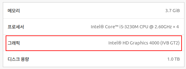 실제로 시스템 설정에 들어가 보면 그래픽카드가 "Intel HD Graphics 4000(IVB GT2)"라고 되어 있습니다.