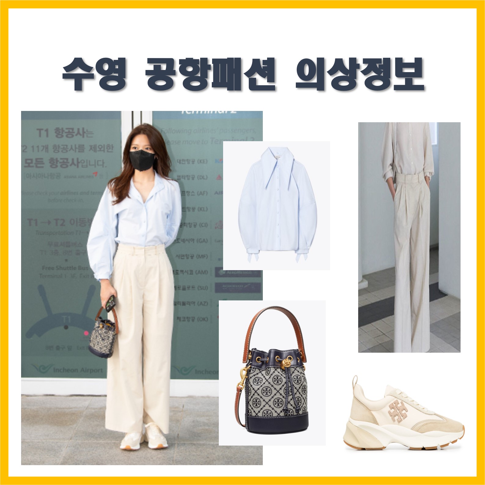 수영님이 공항패션으로 선택한 브랜드는 대부분 토리버치네요. 토리버치 코튼 포플린 보우 블라우스, 노프라미스 썸머 울 와이드 팬츠, 토리버치 티 모노그램 쟈카드 미니 버킷백, 토리버치 굿럭 로고 패치 스니커즈 입니다.