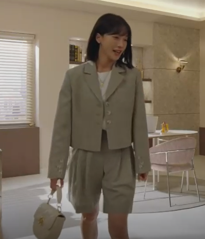 현재는 아름다워 8회 의상입니다. 소영은역으로 나오는 배그린 반바지 투피스 셋업입니다. 모우트의 제품입니다.