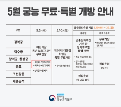5월은 궁능 무료 특별개방이 있습니다. 어린이날, 어버이날 각종 행사도 한다고 하니 참고하시기바립니다.
